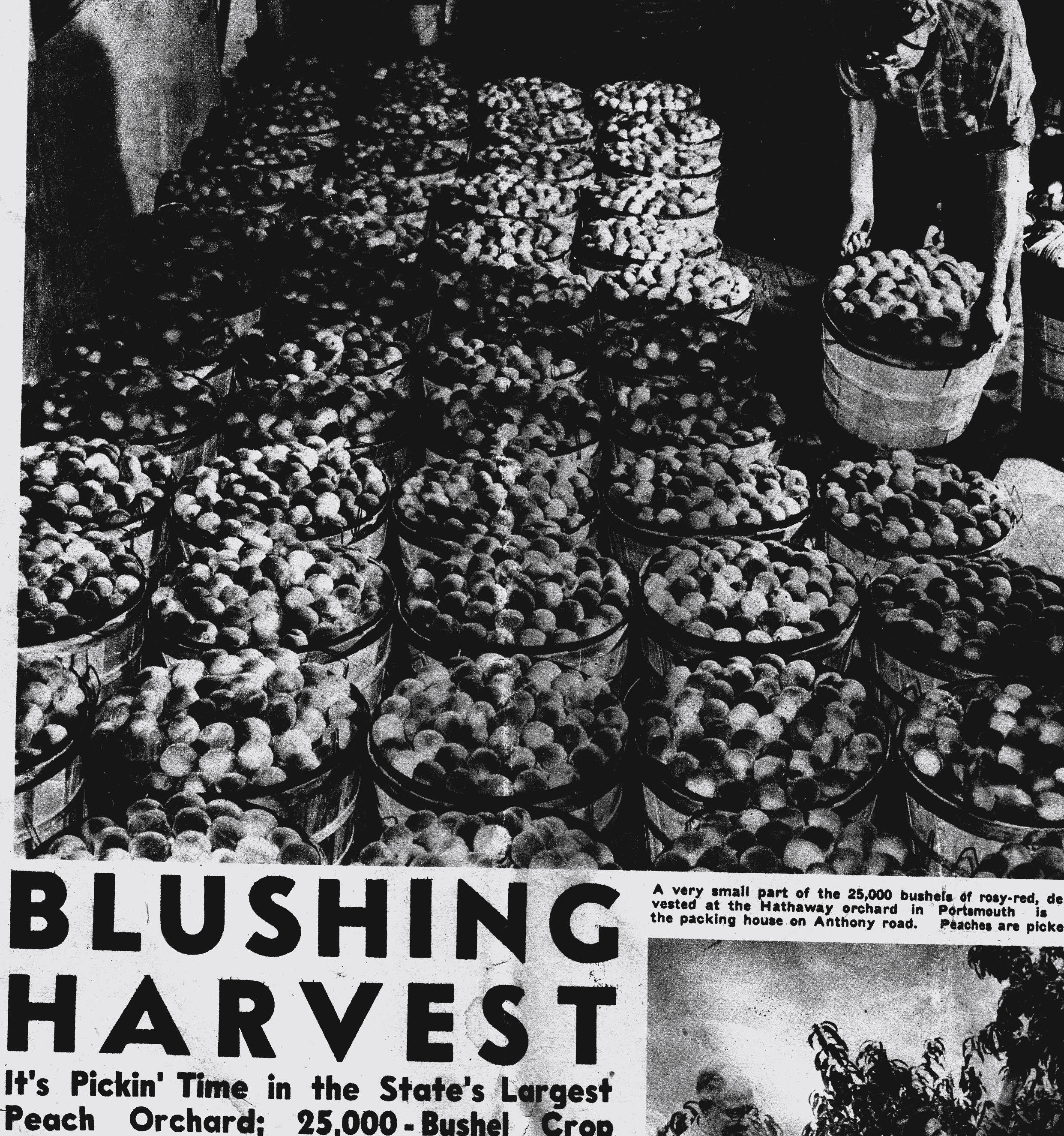 In 1944 Hathaway had the largest peach orchard in the state and produced 2500 bushels. The peach tree rows were over a mile long. The picking season lasted six weeks. Fifty workers were needed and boys and girls earned two or three dollars a day for their work.