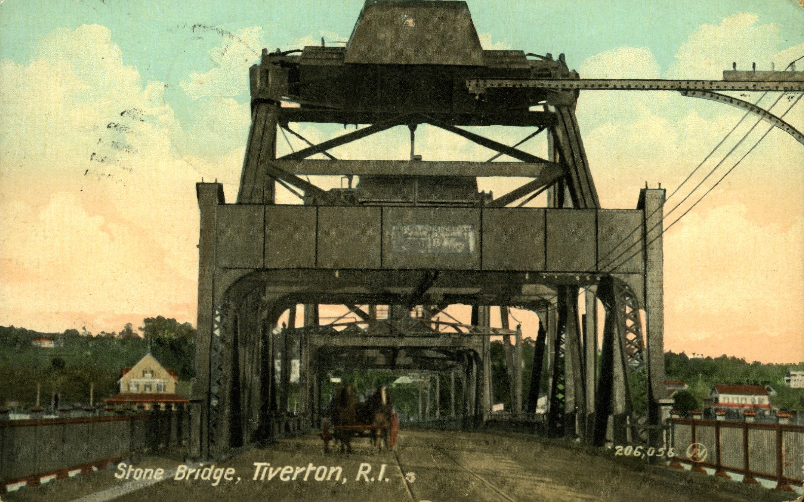 From the earliest days, there was a ferry across the Sakonnet River to Tiverton at Howland’s Ferry or Anthony Ferry. The Rhode Island Bridge Company in 1795 constructed a bridge in the area as a private, tolled bridge. The area around the bridge has treacherous currents and the bridge washed away in 1796. They tried rebuilding in 1798 and it was forced to close until 1808. It was ‘rebuilt after destruction by the Great September Gale of 1815 and received its name as “the Stone Bridge.” After the draw bridge portion was washed away in 1869, it was sold to Tiverton and Portsmouth. The towns turned it over to the state. The structure was rebuilt and reopened in 1871 as a free bridge. In 1957, it was replaced by a new Sakonnet River bridge. Now it serves as a picturesque fishing pier on the Portsmouth side.