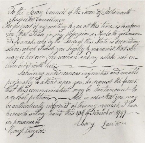 “The purpose of my writing to you at this time is to inform you, that slave in my possession, a Mulatto girl named Mariah, who by the laws of this state is deemed my slave; which I wish to you legally to manumit, that she may be her own free woman, and my estate not encumbered with her.” (Mary Lawton to the Portsmouth Town Council in 1797). *
