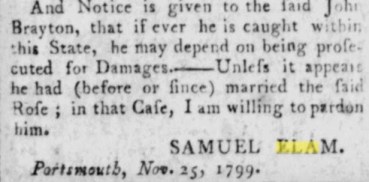 In 1799 Elam posted a notice in the Newport Mercury for a runaway-slave. He does want the slave (named John Brayton) back, but he does show some mercy. Rose Phillips, “a lusty middle aged Woman” escaped with John. Rose had been freed on condition that she work for three years and she hadn’t completed that service. Elam shows some mercy, however. If John is caught he would prosecute him unless he had married Rose!!