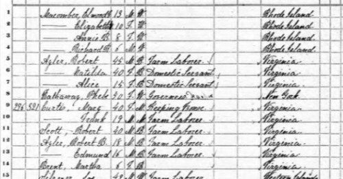 Who were the sixteen that came with Macomber? From the 1870 census we have some clues. In a previous blog I told the story of the Ayler family. Among those living on Macomber property were Morgan and Matilda Ayler and their children Robert, Edward and Alice. Daniel Ayler was another son, but he doesn’t appear on the census. Fannie Scott and her husband Robert Scott are there as well. Fannie is listed as Martha Brent – but there were some difficulties with other names on that census. Fannie is the sister of Matilda Ayler and in the 1880 census she is listed as being in the Ayler household. Other Virginia born residents at Macomber’s farm are Frank and Mary Curtis. We know from the obituary of William H. Parker (known as Billy) (Newport Mercury, 5/8/1936) that he came at the same time as Morgan Ayler. That accounts for 11 of the 16 listed as the number Macomber brought to Portsmouth. Who were the others? I can’t answer that without more information. I am not even clear what date they came to Portsmouth.