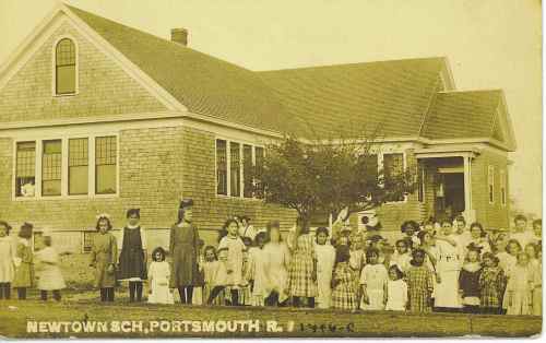In a time when Portsmouth had trouble retaining good teachers, Edna Brophy’s long career demonstrates her dedication to teaching.  A 1973 “Gristmill Column) letter in the Newport Daily News tells us a little about Miss Brophy and Newtown School.  Laura E. Wilkey wrote:  “In 1923 I was in Miss Edna Brophy’s classroom in Newtown School  Miss Brophy (remembered for the fancy aprons she always wore) was principal and taught first and second grades. In the northeast room, Miss Flora Phinney taught third and fourth grades.  The west room contained only the fifth grade, the only fifth grade in town.  Mrs. Gladys Seabury Haggerty ruled fifth grade, which contained ‘big kids’ from all over town.  They either walked to school or rode the trolley cars which went from Newport to Fall River and Newport to Bristol Ferry.”  All the other primary schools in Portsmouth were one room schools. Quaker Hill School had two rooms – one for grades six and seven and the other for grades eight and nine
