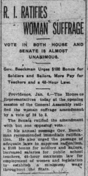 “A meeting of the women voters was held at Town Hall on Wednesday afternoon. They were addressed by Mr. Davis Arnold of Bristol Ferry, who instructed them in the use of the ballots and many questions were answered by Mr. Arnold. ” Newport Mercury, October 30, 1920.