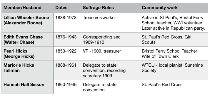 The History of Women Suffrage* notes that the work of the Newport County Woman Suffrage League was “at first largely carried out by an active group of philanthropic women of Bristol Ferry.” In other blogs we have talked about some of the ladies who were founding members: Sarah Eddy, Mary Ballou, Sophie and Cora Mitchel, Clara May Mitchel and Emeline Eldredge. Who were some of the other women who served in leadership roles while the suffrage movement was centered in the Bristol Ferry neighborhood? Some of the women had deep Portsmouth roots and were the typical wives, mothers and daughters – Lillian Wheeler Boone, Edith Chase, Letitia Lawton, Pearl Hicks, Marjorie Hicks, and Hannah Hall Sisson.