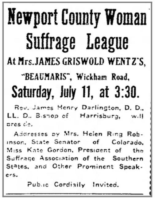 When Maude Howe Elliott took over as President of the Newport County Woman Suffrage League the center of league activities moved to Newport. Georgie Nichols Wentz (Mrs. James Griswold) is a good example of the Newport summer colonists that joined the league and helped the effort. While in Newport, Georgie Wentz worked hard for her causes. As early as 1914 Newport County Woman Suffrage League meetings were being held at the Wentz home – “Beaumaris.” Newspaper articles show her as a speaker at suffrage meetings and demonstrations. In 1915 she helped with Mrs. Belmont’s event at Marble House. Mrs. Wentz (along with several other socialite suffragists) are listed as Vice-Presidents of the Newport County Woman Suffrage League in 1917.