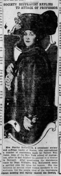 Katherine McCormick’s glamorous image graced the front page of national newspapers in October of 1913. The newspaper articles told of a scene at the Colonial Theater in Newport. The Rhode Island Association Opposed to Woman Suffrage rented the hall for a free lecture by a noted journalist who opposed the suffrage movement. The Boston Globe (11/11/1913) reported that after Talcott Williams spoke against “votes for women” the three women (Katherine McCormick, Maude Howe Elliott and Mrs. James Wentz) “arose one after another, and refuted every argument he had made. Their pointed questions worried Mr. Williams considerably, it is said, but he stood his ground — that is, he remained on the platform until the end of the meeting. The Anti-Suffragists, however, marched indignantly out of the hall – a pantomime of what they thought of the performance. Then the Suffragists forces ended the meeting with a demonstration for their ’cause,’ the Anti-Suffragists having paid for the use of the theatre for the evening.”