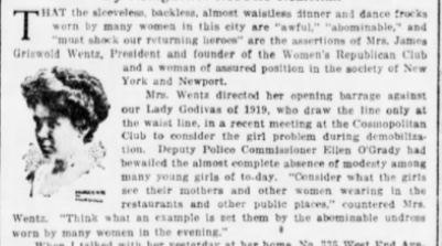 What is your image of the suffragists? Georgie Wentz may not fit the stereotypes. Her campaign against immodesty in women’s evening dress got coverage in the New York Times and other publications. She opposed cocktails, cigarettes and the “drug habit.” Apart from suffrage, her passion was electing Republicans. Even before she was able to vote she worked on the campaigns of Benjamin Harrison and William McKinley. She actually went door to door in the tenements of New York to campaign for her candidates.