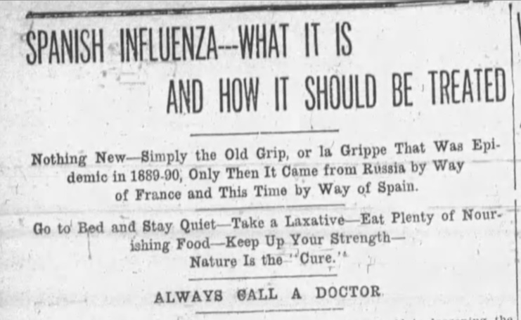 “People who have influenza symptoms should not be kept on at work the way they did last fall, thus spreading the fatal scourge all over the county. It was shown that a person having the disease mildly might communicate it to others who would have it severely and die therefrom. People who have even a slight case have no right to endanger the lives of others by venturing out in the public. They will be far safer themselves by remaining at home, and caution on their part will save the community from great peril.”