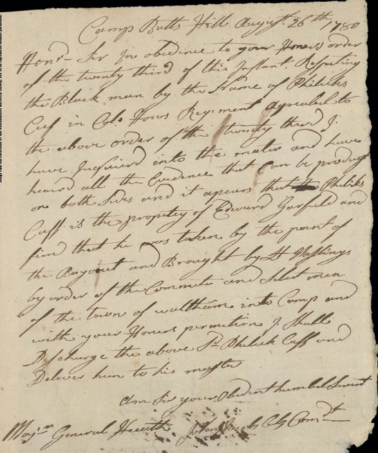 “In obedience to your Honor’s order of the twenty-third of this instant, respecting the Black man by the Name of Philicks Cuf in Col. Hows Regiment Agreable to the above order of the twenty third I have Inquired into the mater and have heard all the evidence that Can be produced on both Sides and it appears that Philiks Cuff is the property of Edward Garfield and find that he was taken by point of the Bayonet and Brought by Lt. Hastings by order of the Commitee and Select men of the town of waltham into Camp and with your Honors permission I shall discharge the above Sd. Philicks Cuff and Deliver him to his master.” *