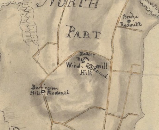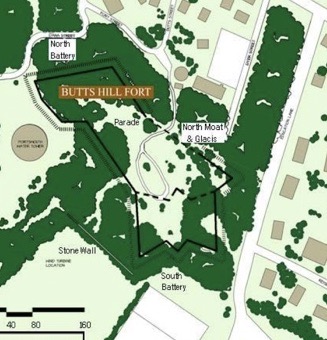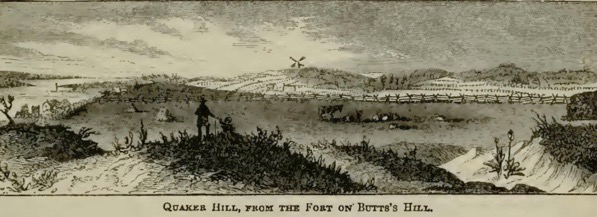 Quaker Hill Engagement: The British units that had engaged with American Forces were now engaged on Quaker Hill. The British forces formed a line that extended from East Main Rd to about where Sea Meadow Drive is located. Americans were also formed between the Quaker Meeting House and Hedly St. General Sullivan sent reinforcements to Quaker Hill, giving the Americans the upper hand, but only for a short time. Both sides engaged on the hillside over a poorly defended artillery position. American forces were able to secure the position. The British attacked and poured effective volleys of musket balls into the Americans causing them to retreat. Sullivan ordered the units fighting on Quaker Hill to retreat back to the mainline around Butts Hill Fort. The engagement on Quaker Hill lasted a full hour. The British attempted to attack Butts Hill Fort but the 18 pound cannons from Butts Hill Fort kept the British from advancing.