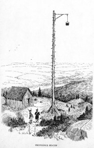 With the threat of war in 1775, the beacon system was re-established. In June of 1775 a post was established on Tower Hill in South Kingstown. Solomon Drowne, who taught at Brown, described the Providence pole to his brother in a letter dated August 12, 1775. “The Beacon Pole Mast is raised on the hill, ..nearly opposite the Church (likely First Baptist). I have heard said, is 80 feet higher than the top of the new meeting house steeple which is upward of 180 feet from the ground….”