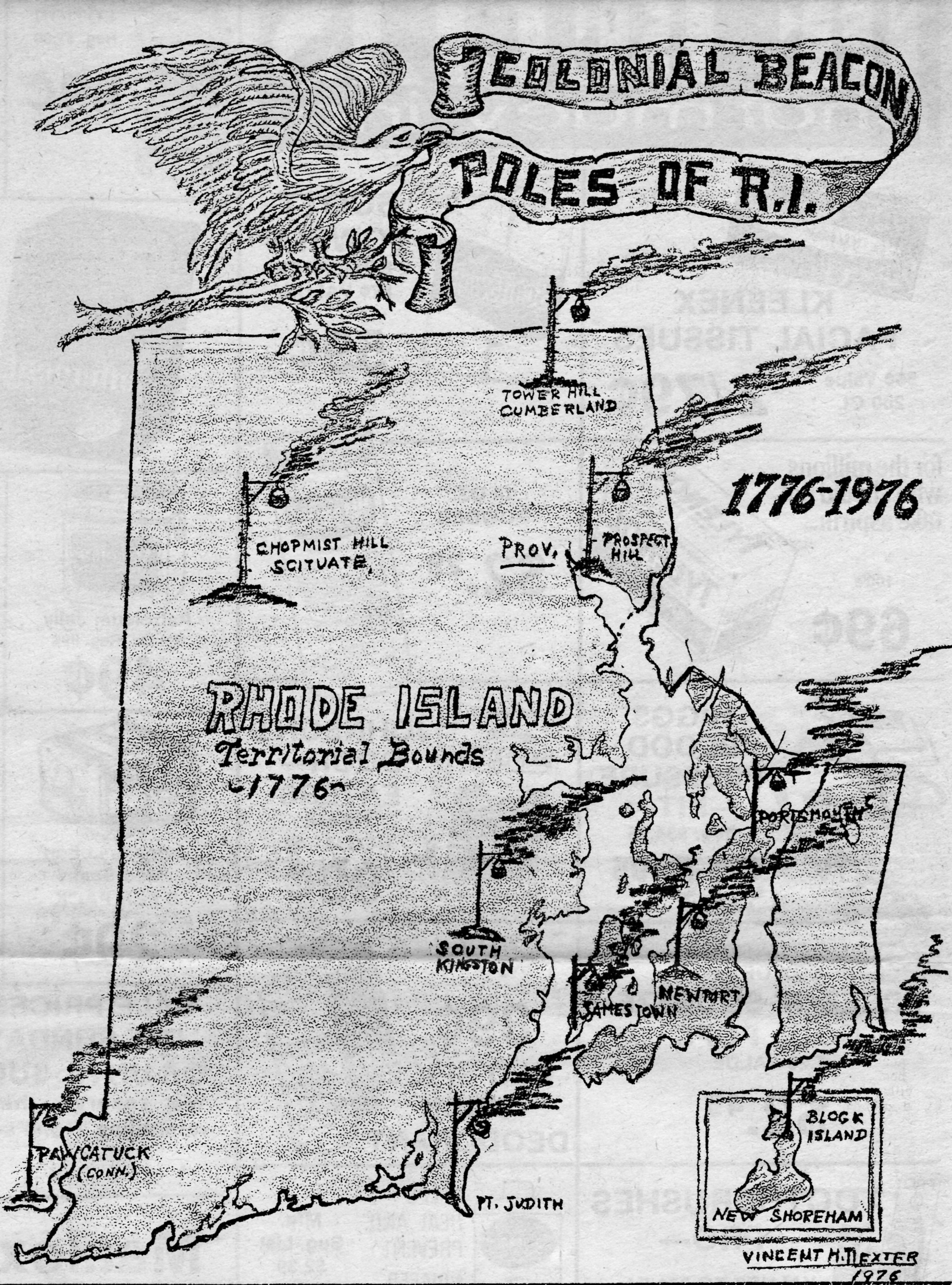 In 1776 there was a pole erected on Beacon Pole Hill in Cumberland and on Chopmist Hill in Scituate. A fourth beacon was erected at Tomony Hill in Newport. This beacon was test fired on June 20th, 1776 and could be seen in Providence.