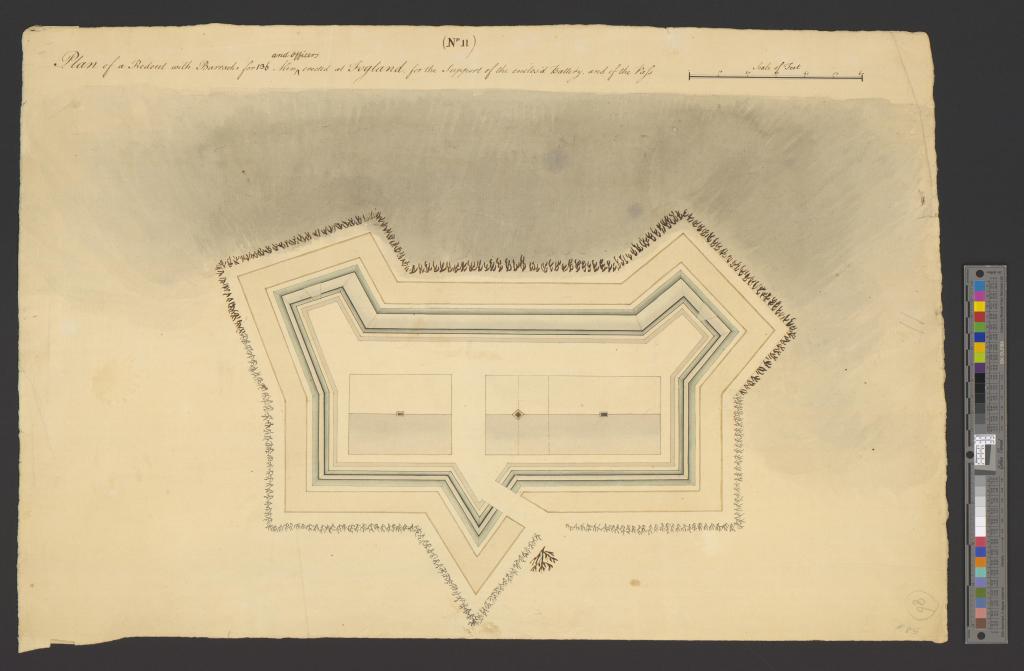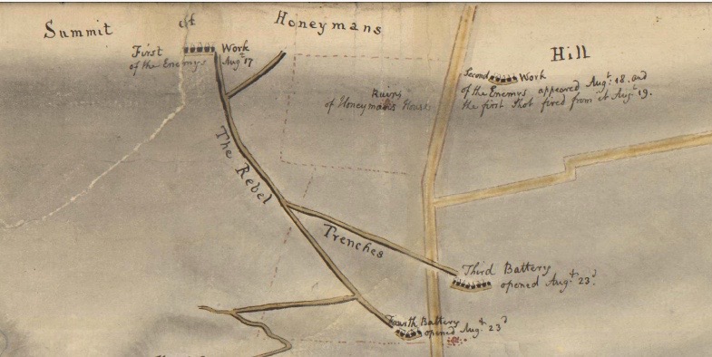 “Plan of the works, which form the exterior line of defence, for the town of New-Port in Rhode Island : Also of the batteries and approaches made by the rebels on Honeymans Hill during their attack in August 1778 / This plan surveyed and drawn by Edward Fage, lieutt of artillery, November 1778.”. https://quod.lib.umich.edu/w/wcl1ic/x-8373/wcl008443. University of Michigan Library Digital Collections. Accessed November 21, 2022.