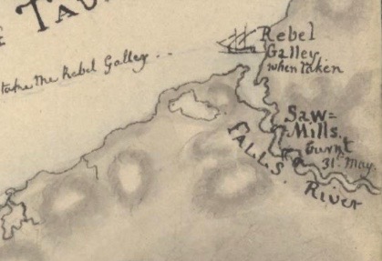 31st May…The General and the Commodore having determined to attempt destroying some Saw Mills, and a quantity of Plank for building boats, which they had upon Fall River; the Pigot Galley, A Gunboat, some Flat boats, and the boats of the Flora, Juno, Venus, Orpheus, & Kingfisher, under the direction of Captain Christian of The Kingfisher; with 100 men of the 54th Regiment under the Command of Major Eyre of that Regiment; were ordered for this service. At 12 oClock last night they passed through Bristol ferry, unperceived by the Rebels, and proceeded up Mount Hope Bay, except the Pigot, which unfortunately ran aground in the upper part of the Passage, which gave an alarm to The Rebels, who immediately communicated it by firing Signal Guns which were repeated on both sides of the Bay. The boats waited some time in hopes of being joined by the Pigot, but finding the Alarm was given, they moved on to their destination without her, and on approaching the shore near Fall River, they were fired on by a Guard of about 40 men; but pushing directly in, the Troops landed and dispersed the Enemy. They then proceeded to the First mills, where one Saw-Mill, a Corn Mill, 9 large boats and about 15000 feet of Plank were burnt. On advancing a small distance toward the other Mills, they found a considerable Number of the Enemy posted at, and above them, from whom they received a heavy fire by which 2 men were killed, and an Officer & 4 men wounded. It being then judged imprudent to attempt forcing the post, or to continue longer on shore, the troops returned to the boats, and re-embarked without molestation.