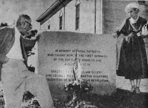 “In memory of those patriots who fought here in the first skirmish of the Battle of Rhode Island, August 29, 1778. Erected by the William Ellery and Colonel William Barton Chapter, Daughters of the American Revolution.”