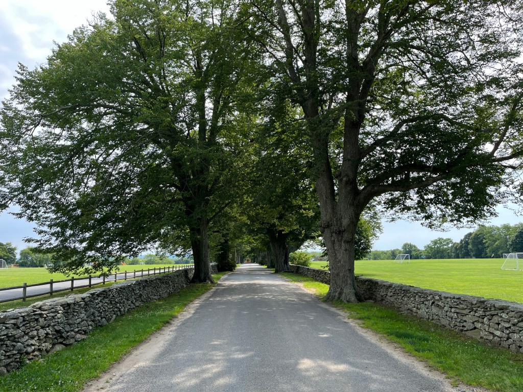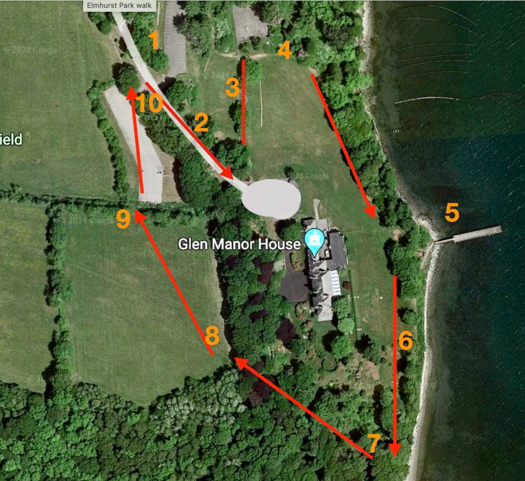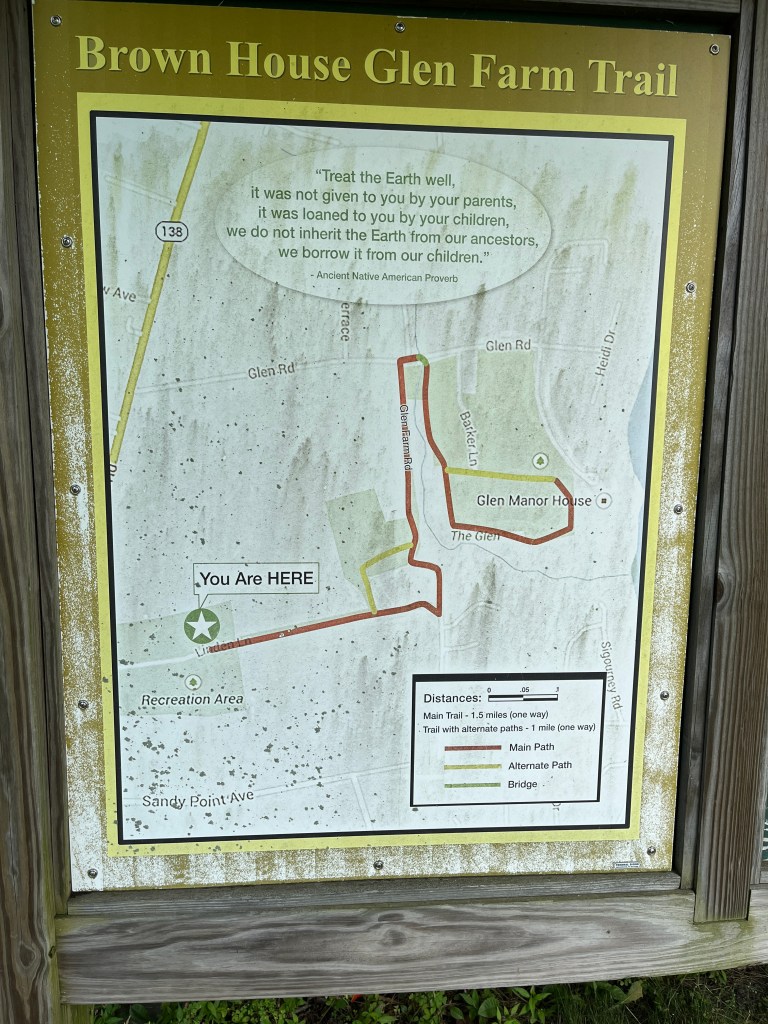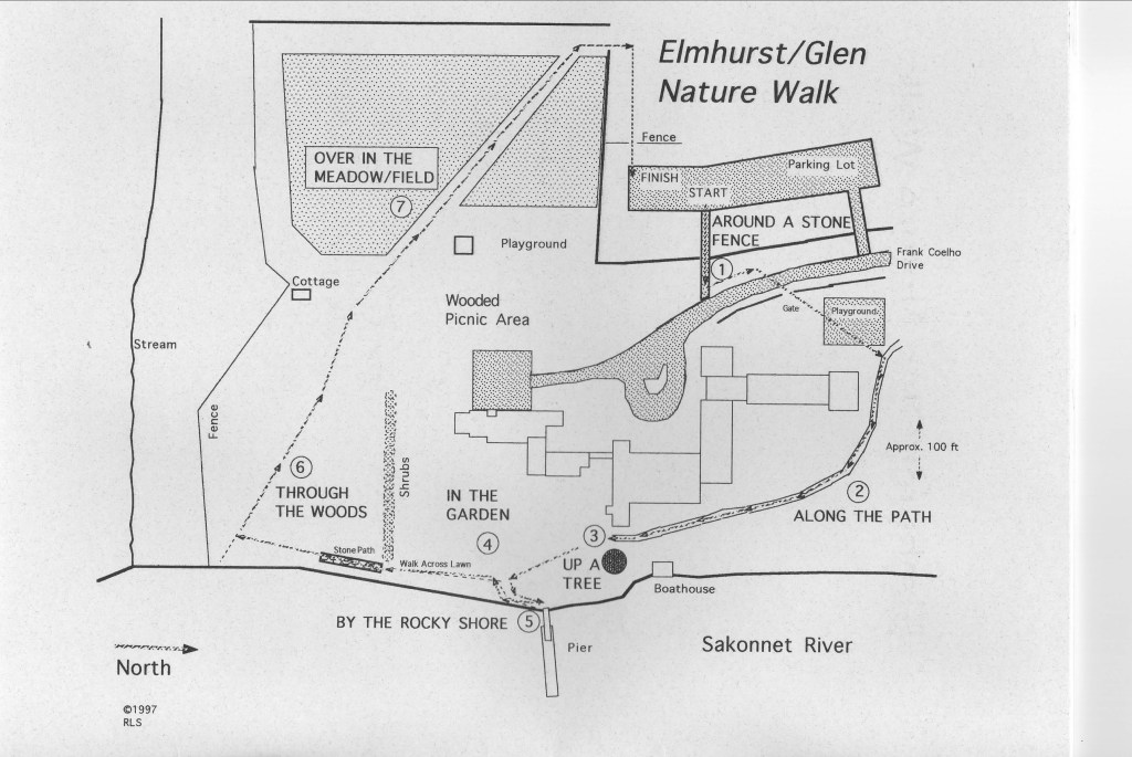 - Cross the Meadow/Field towards the Trail sign that marks a longer Brown House/Glen Farm Trail. That trail is over 2.5 miles and is a good one for a longer hike. To the left of the sign is a rocky cut in the stonewall that leads you to the old Elmhurst parking lot. Cross the lot to the North entrance.