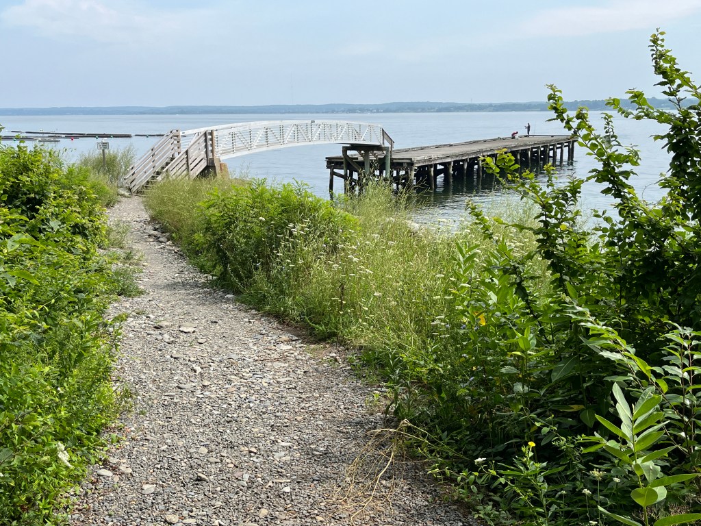 - “By the Rocky Shore” explored the dock and rocky shoreline. We can see Sandy Point Beach in the distance to the right. Our town beach was a gift of the Taylor family. To the left is an oyster farm. Life along this shoreline depends on the constant cycle of the tides. The current dock is a replacement for the original “L” shaped dock that the Taylors used. You may see fishermen on this dock and it is a good place to watch for marine birds.