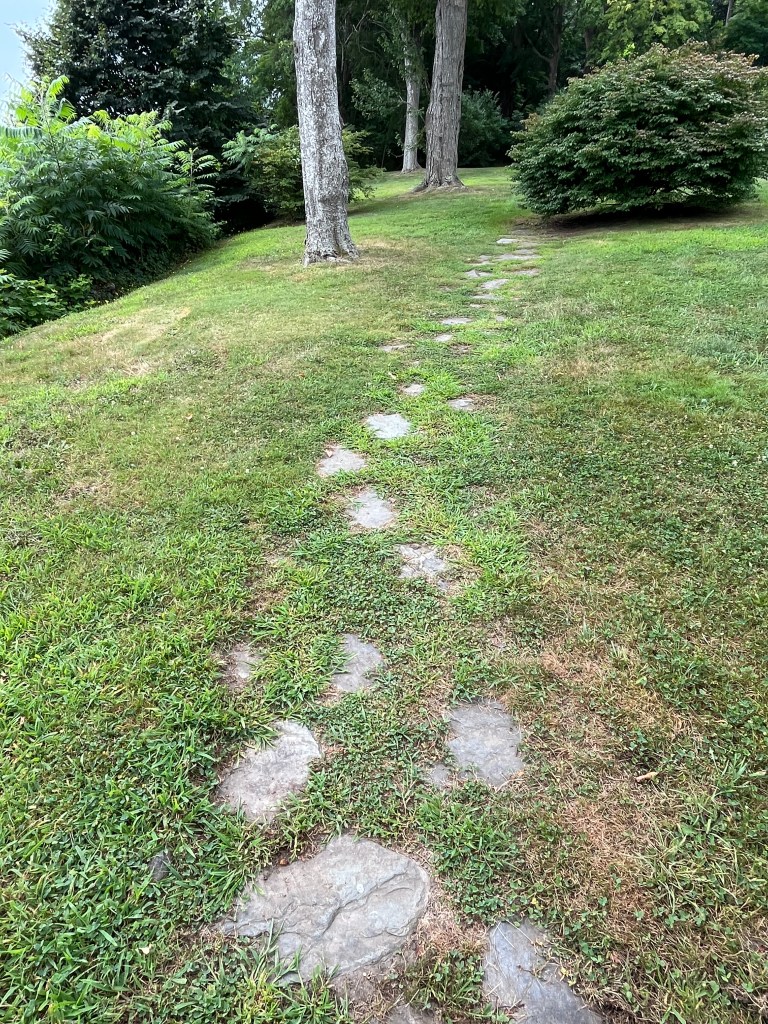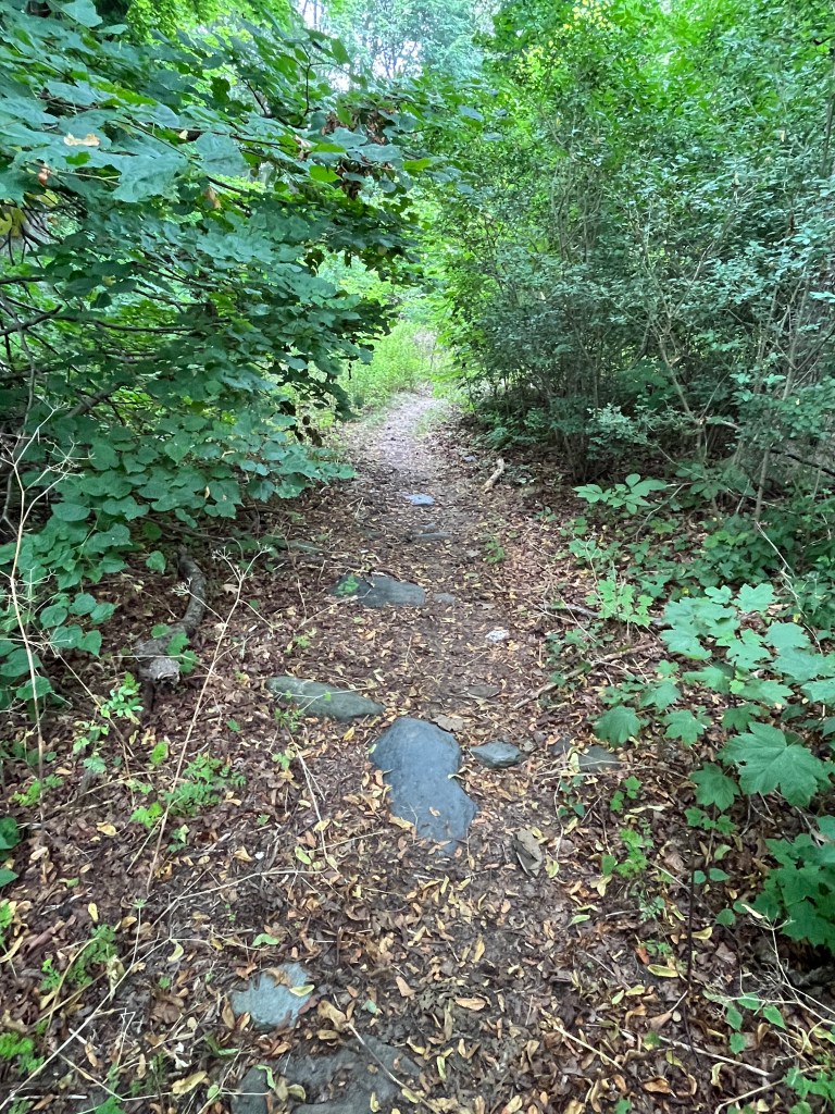 - A walkway of stones leads you “Through the Woods.” Where there are stones in the paths is easy walking, but as the path heads up the trail it is narrower.