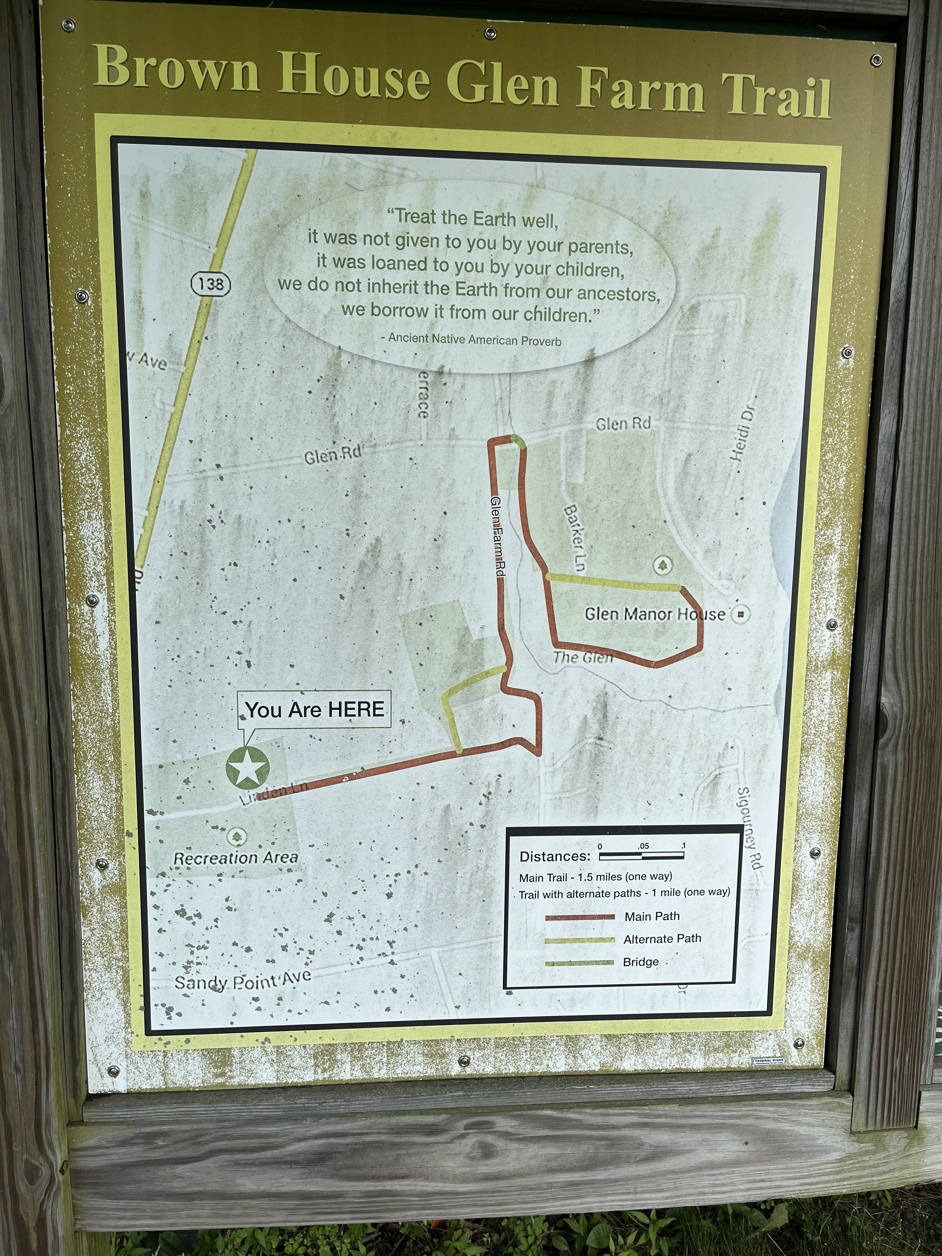 - Cross the Meadow/Field towards the Trail sign that marks a longer Brown House/Glen Farm Trail. That trail is over 2.5 miles and is a good one for a longer hike. To the left of the sign is a rocky cut in the stonewall that leads you to the old Elmhurst parking lot. Cross the lot to the North entrance.