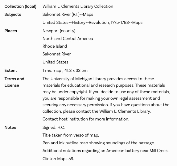 Looking at the Denison map in general there is a compass on the left hand side. There is a scale for two miles and there is a legend of sorts for the positions of the American commanders. The mapmaker lists himself as J. Denison “Scripsit” which means writer. The map covers the areas and dates involved in the “Rhode Island Campaign” – mainly Aquidneck Island and the surrounding waterways. Notes on the bottom of the map tell us that the original is at the Massachusetts Historical Society and that this version is a copy. A note at the bottom provides a legend for symbols in color in the original.