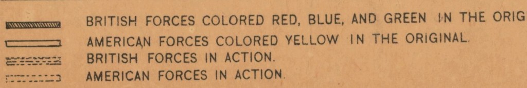 The Archives map has no key, but it does have a compass and scale. The names of the commanders are written out, but the positions are the same as in the Denison map.