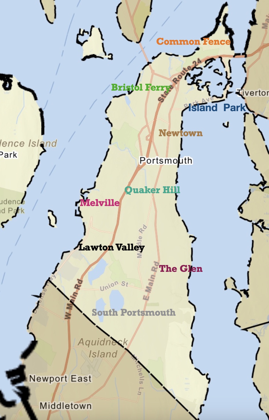 Looking at the Denison map in general there is a compass on the left hand side. There is a scale for two miles and there is a legend of sorts for the positions of the American commanders. The mapmaker lists himself as J. Denison “Scripsit” which means writer. The map covers the areas and dates involved in the “Rhode Island Campaign” – mainly Aquidneck Island and the surrounding waterways. Notes on the bottom of the map tell us that the original is at the Massachusetts Historical Society and that this version is a copy. A note at the bottom provides a legend for symbols in color in the original.