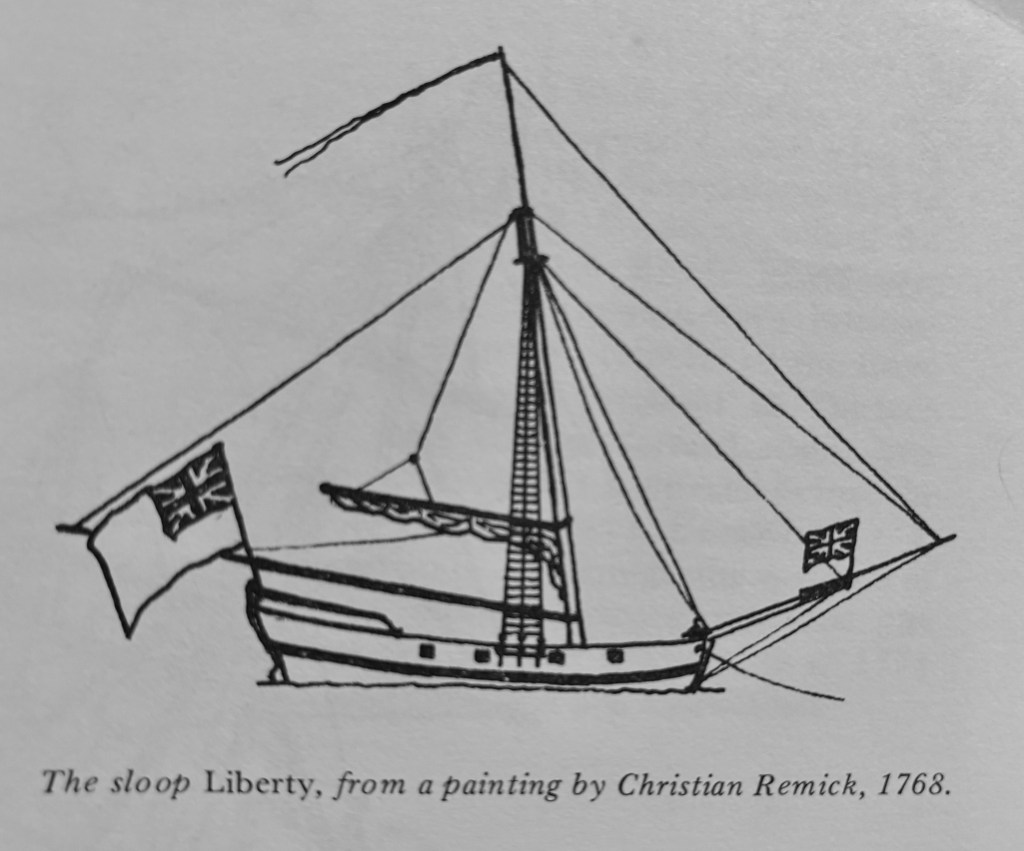 On the 19th of July in 1769 a Newport mob was so exasperated with the captain of a sloop owned by Royal Commissioners that they “went on board the Liberty as she lay at Anchor in the Harbour, and cut her cables, and let her drift ashore, they then set her on fire…” (Boston Chronicles, 24, July 1769). This incident was almost three years before the burning of the Gaspee. The Liberty burning has some aspects in common with the Gaspee Affair. Both were protests to the increase in taxation on the colonists. But the roots of the burning of the sloop Liberty have some interesting origins that start with charges brought against John Hancock, the original owner of the Liberty. Liberty’s story begins in Boston.