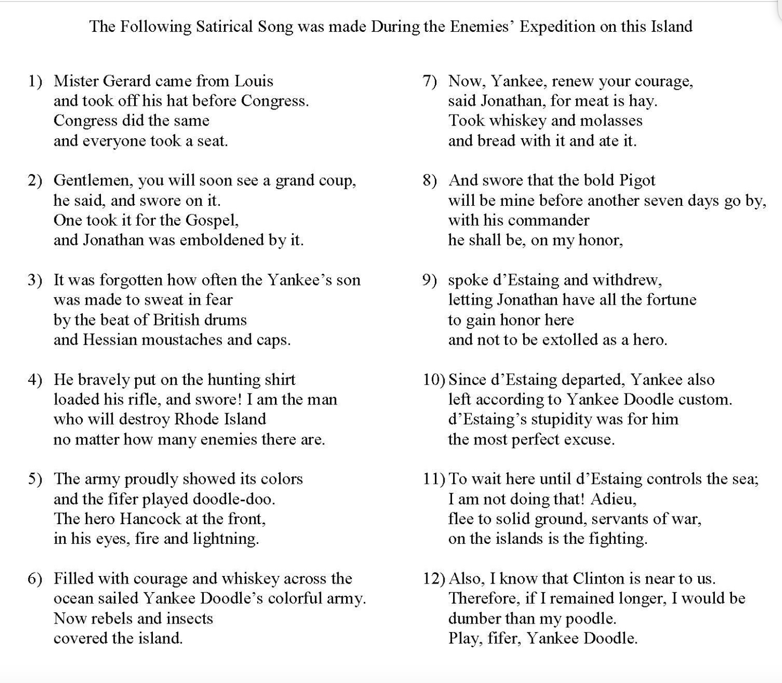 Found in Malsburg’s diary was a poem about the Rhode Island Campaign. There are mentions of d’Estaing, Pigot, Clinton. Ludwig is French King Louis. The term “Jonathan” was a commonly used to denote someone from New England. Hancoc refers to John Hancock. Hancock was actually at the Siege of Newport, but left before the Battle.