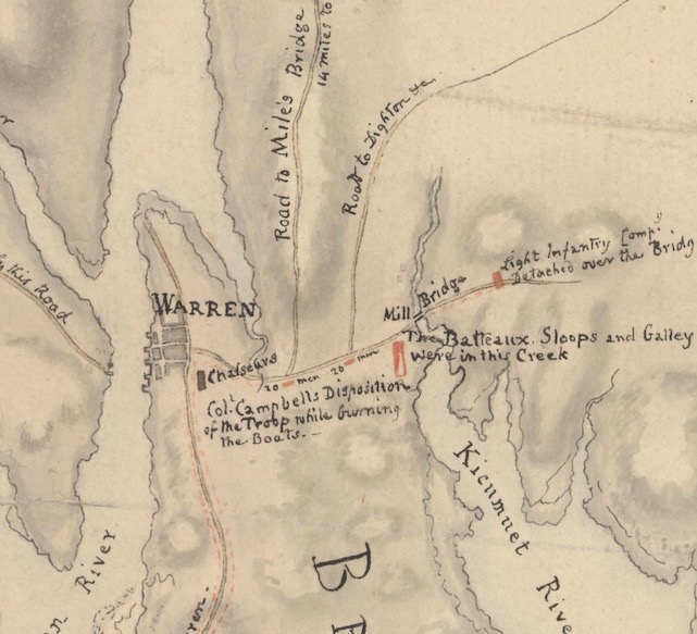 As the American forces were preparing for an attack on Aquidneck Island in Spring of 1778, the British forces were active in trying to crush the Rebel capability to transport troops across the river from Tiverton. The Rebels would need to reach Rhode Island (Aquidneck) by boat and the British planned to attack shipyards, lumber mills and military stores. On May 25, 1778,British soldier Frederick Mackenzie records that the 22nd Regiment, Companies of the 54th, Notenius’s Company of Hessian Chasseurs, ..etc. (500 men in total) moved to Arnold’s Point in Portsmouth. They embarked in flatboats and landed at the mouth of the Warren River. Campbell’s men were divided into two columns. In the town of Warren itself they burned down the Baptist meeting house and other buildings, ransacked homes and property. The other group of Campbell’s men headed to the Kickemuit River. By the Kikemuit Bridge they found and burned 125 boats, large batteaux capable of carrying 40 soldiers. They found a sloop loaded with military stores, a store house, and a corn mill and they burned them. They also burned houses, a bridge and gun carriages. They spiked cannons and set fire to new Privateer Sloop as well as magazines of gun powder.