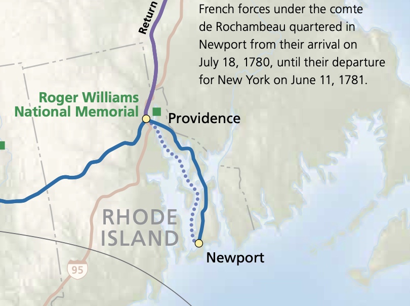 As the road to Yorktown began, Rochambeau and his general staff left Newport on June 10, 1781. He arrived at Providence the following day. Brigadier General de Choisy was left behind in Newport with some French troops. In August he sailed with Barras’ fleet to the Chesapeake area. On the morning of June 11, 1781, the first Brigade of French troops began to load onto the small vessels in the harbor of Newport. All the troops had left by the 12th and camped on the west side of Providence between Westminster and Friendship streets. The French Army performed a grand review in Providence on June 16, then set out for Coventry in four divisions. One division departed each day from June 18 to 21. Rochambeau left Providence with the first division (the Bourbonnais Regiment) and arrived at Waterman Tavern in Coventry in the evening of June 18.