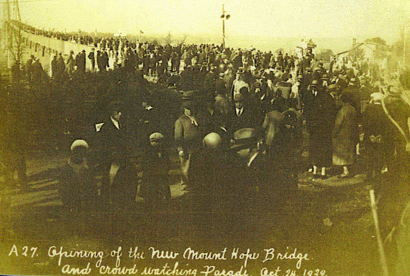The Portsmouth Historical Society has items from the opening festivities of the Mt. Hope Bridge in 1929. Those items include an invitation, guest badge and photographs of the construction and ribbon cutting. A front page newspaper article from the time helped us to understand how elaborate the ceremonies were. Senator William H. Vanderbilt presided over the pageant. Beginning at 10 in the morning a parade began in Bristol – a “tableau” depicting Roger Williams organized by the Rhode Island Historical Society. The Newport Historical Society organized a tableau and parade depicting John Clarke and they marched from the Aquidneck Island side. At 11 AM “Roger Williams” met “John Clarke” and unfurled flags at the center of the bridge and exchanged greetings. There was an Indian ceremony in which Governor Case and Senator Vanderbilt became members of the Algonquin Council. Vice President Charles Curtis signaled from Washington, D.C. at noon to begin the dedication of the bridge. The program lists events such as a christening of the bridge, ribbon cuttings and acceptance of bridge certification. The ceremony was even broadcast on WEAN at the old Outlet Building in Providence.