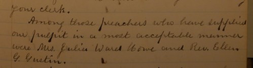 Rev. Gustin supplied the pulpit and served unofficially as a co-pastor from 1872 to 1878. Church records show no concerns about a woman taking on such a leading role in the congregation. Ellen was a friend of Julia Ward Howe and shared her work in the Suffrage movement. In 1872 the Executive Board of the church voted to allow a lecture on suffrage at the church. Ellen spoke at major meetings of the Woman Suffrage Association in New England.