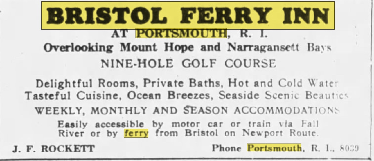 The Bristol Ferry Inn advertised in New York papers like the Brooklyn Eagle in 1926. A Nine-Hole golf course is advertised at this time.