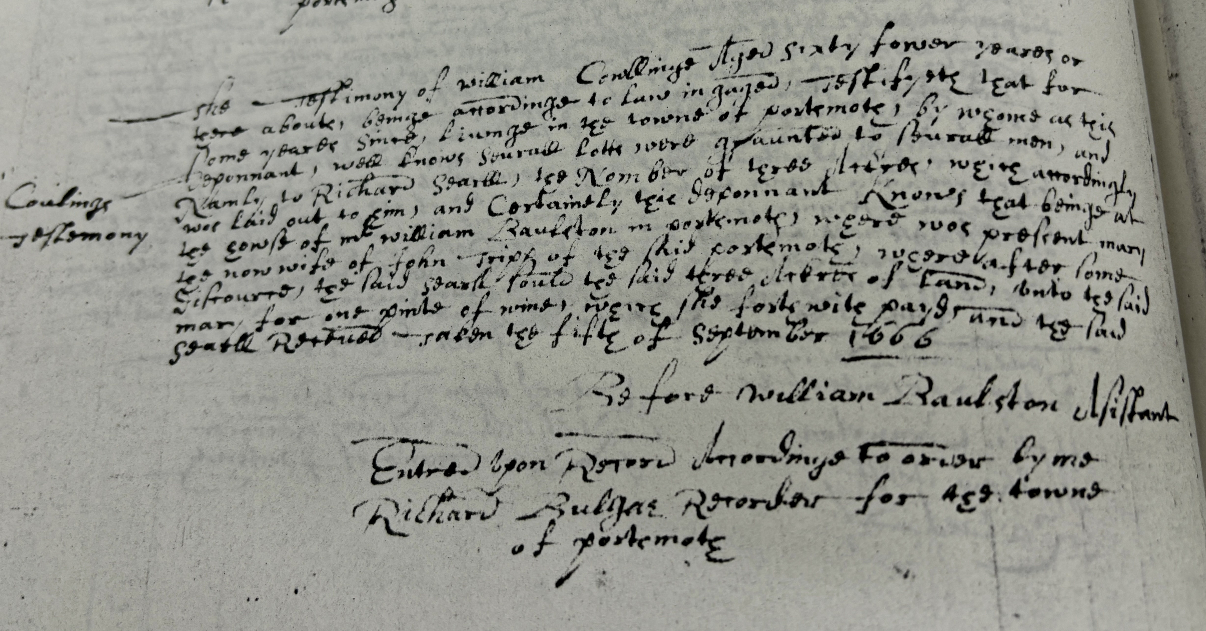 I recently shared the story of Mary Payne (Tripp) trading a 3 acre land grant for a pint of wine. One of the audience members questioned me about whether this was a just a story or really true. The story came from Portsmouth historian Edward West and I trusted his scholarship. He spent lots of time working with town records. I like to see the primary sources, so I began to look for confirmations. Tripp family genealogies gave me some clues of where to find the answers. One of these family histories said that the court of Commissions, on 8 Dec 1666, confirmed the sale. I wasn’t sure what the court of commissions was. Another family history stated that someone named Collings had testified in Mary’s behalf. A former Portsmouth Historical Society curator remembered seeing a transcription of Collings’ testimony in the society collection. The society’s collection has been re-organized and I wasn’t able to find it, but I knew it had to be somewhere. I went to the office of the Town Clerk to ask where I could find “Court of Commissions” records. A very helpful worker suggested that if a deed was involved, we could look for it in Land Evidence. We had a date and the name of who was granted a deed, so it was easy to find both the granting of the deed and the testimony of the witness.